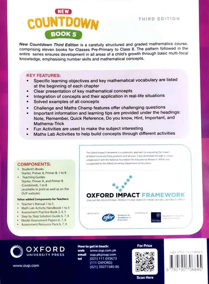 Oxford New Countdown Book 5 for Grade 5 is a comprehensive mathematics guide designed for young learners. This third edition provides a structured approach to key mathematical concepts, from basic arithmetic to advanced topics suitable for Grade 5 students. With engaging exercises, clear explanations, and real-life application problems, it supports both classroom learning and independent practice. Available now at Multan Kitab Ghar for a complete and engaging math learning experience.Oxford New Countdown Book 5 A Comprehensive Mathematics Series for Grade 5 Third Edition Multan Kitab Ghar
